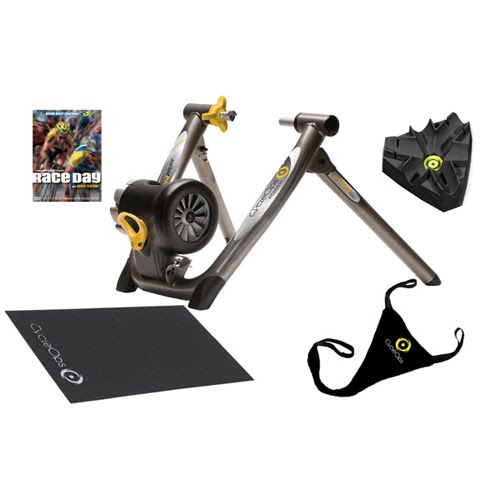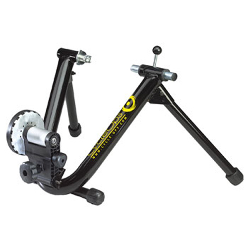 are touted as giving the rider the most realistic riding experience and have the most natural power curve. The intensity and resistance level of your workout is determined by how hard you’re pedaling and the gear you ride in. As you pedal faster the fluid within creates more resistance giving you the feel of riding on the road. Not only are these trainers the most realistic, but they are also the quietest out of the bunch (so if you are on the top floor of an apartment complex you may want to look into these). As the fluid trainers are the “top-of-the-line” on the market they also come with a top of the line price…but CycleOps has provided complete kits with everything you need for winter training at a great price. At $469.99 the JetFluid Pro Winter Training Kit gets you their best JetFluid Pro trainer, a rubber training mat to keep the sweat off your carpet, riser blocks to simulate climbing hills, and a bike thong to keep your remote control or nutrition bar close at hand.
