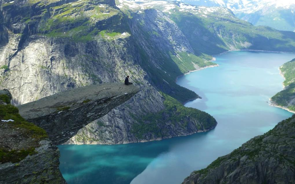“Trolltunga” (Troll’s Tongue) is a narrow rock that hovers above the Ringedalsvatnet lake and overlooks the Folgefonna plateau glaciers. Round trip, this hike takes about 10 hours and is fairly challenging. Hikers embark at Skjeggedal and experience breathtaking views throughout the entire journey.